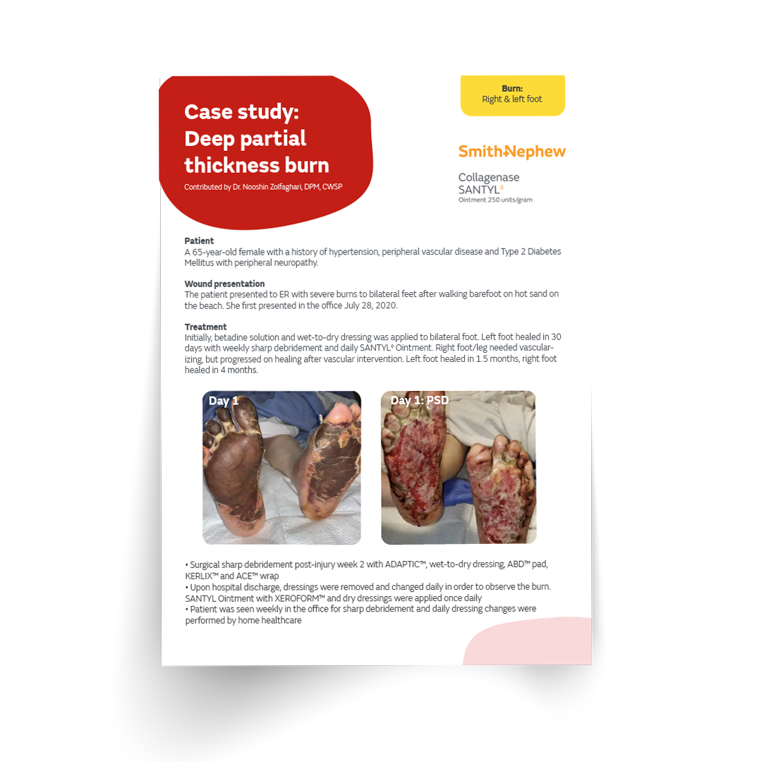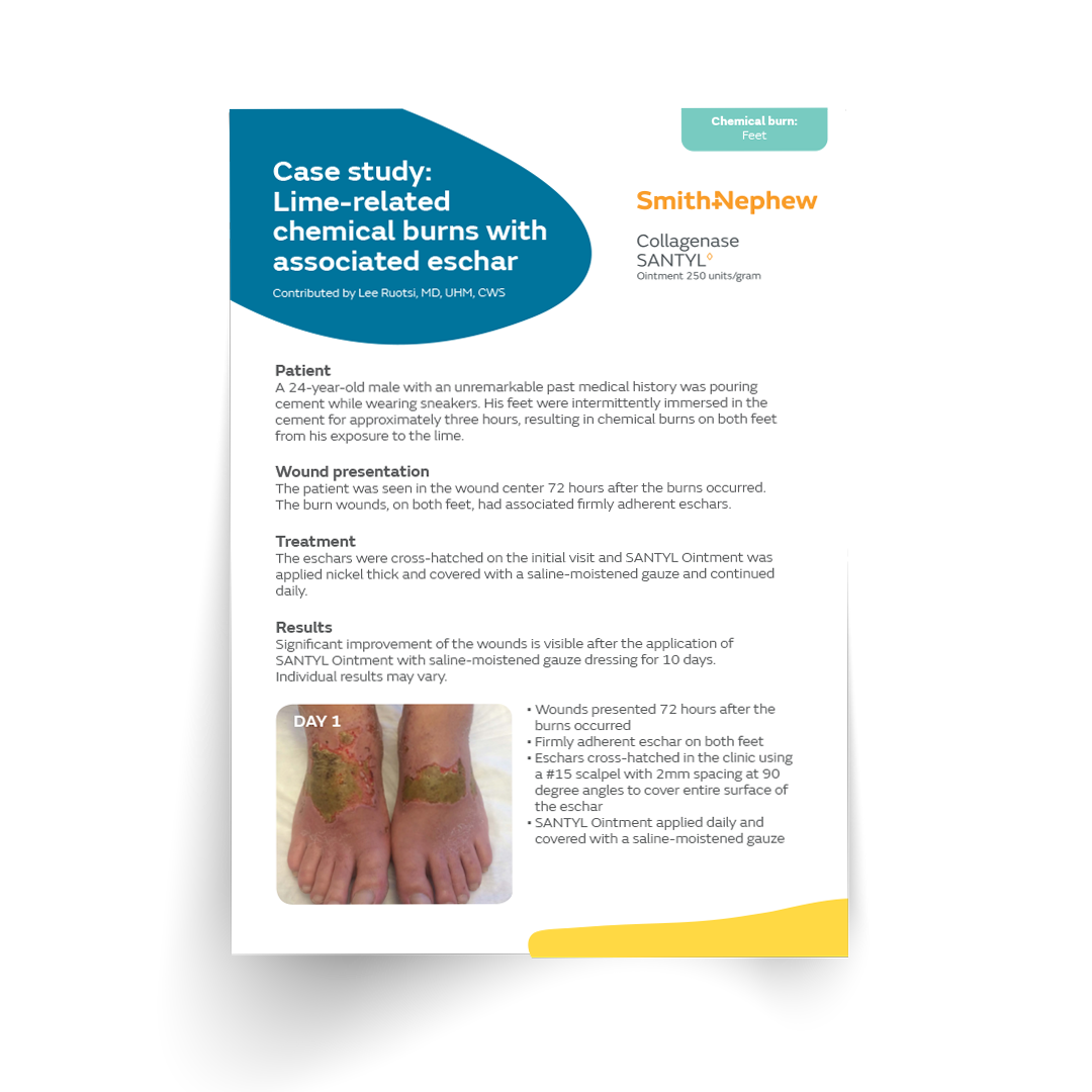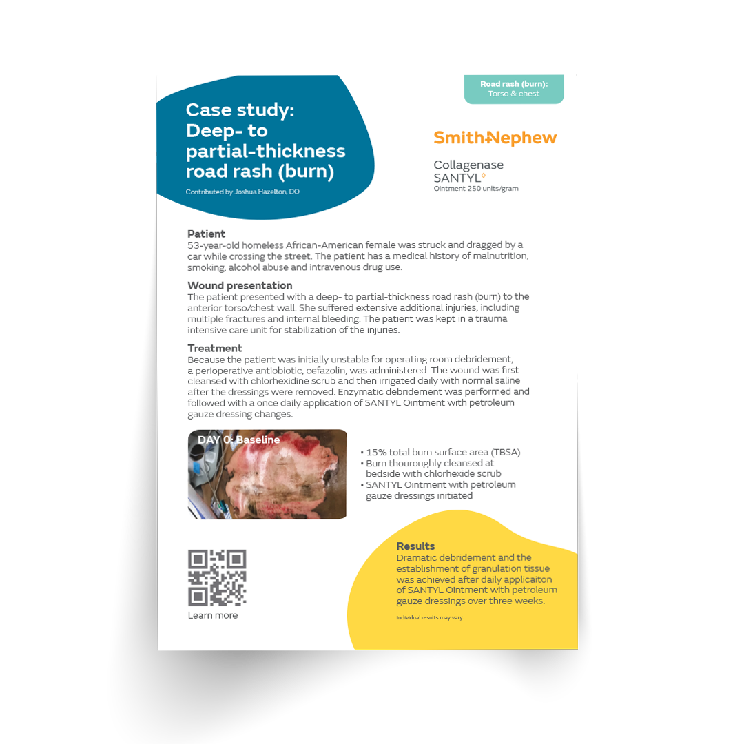 Indications: Collagenase SANTYL Ointment (“SANTYL”) is a prescription-only medication indicated for debriding chronic dermal ulcers and severely burned areas. Contraindications: SANTYL is contraindicated in patients who have shown local or systemic hypersensitivity to collagenase. Warning and Precautions: The optimal pH range of collagenase is 6 to 8. Higher or lower pH conditions will decrease the enzyme’s activity and appropriate precautions should be taken. The enzymatic activity is also adversely affected by certain detergents, and heavy metal ions such as mercury and silver which are used in some antiseptics. As such, the wound should be properly cleansed prior to application of SANTYL. Debilitated patients should be closely monitored for systemic bacterial infections because of the theoretical possibility that debriding enzymes may increase the risk of bacteremia. A slight transient erythema has been noted occasionally in the surrounding tissue, particularly when SANTYL was not confined to the wound. SANTYL is not indicated for wound closure. Discontinue use of SANTYL after granulation tissue is well-established. Adverse Reactions: No allergic sensitivity or toxic reactions have been noted in clinical use when used as directed. The risk information provided herein is not comprehensive. For complete prescribing information, please refer to the accompanying PI or visit: https://sn-burn.com/wp-content/uploads/2023/12/SAPE72-38468_SANTYL-PI-2018-FINAL-APPROVED.pdf You are encouraged to report negative side effects of prescription drugs to FDA. Visit MedWatch or call 1-800-FDA-1088.